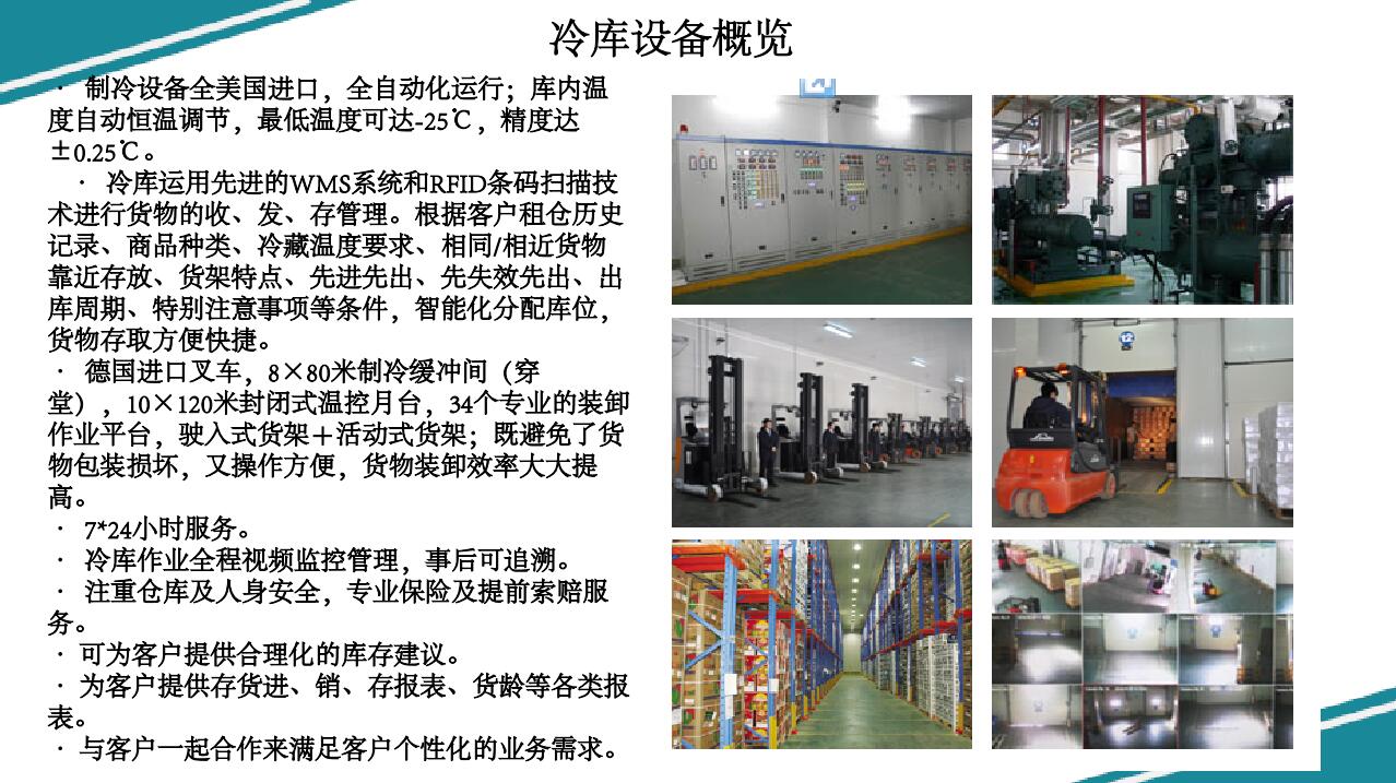 · 德國進口叉車,8×80米製冷緩衝間(穿堂),10×120米封閉式溫控月台,34個專業的裝卸作業平台,駛入式貨架+活動式貨架;既避免了貨物包裝損壞,又操作方便,貨物裝卸效率大大提高。